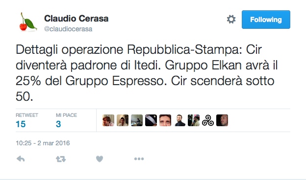 cerasa 1 Pubblicato 2 marzo 2016 su 624 × 368 in Stampa-Repubblica. Fusione al traguardo. De Benedetti padrone di Itedi. A Elkann il 25% dell’Espresso. La Borsa ci crede, volano i titoli dei due gruppi ← Precedente Successivo →