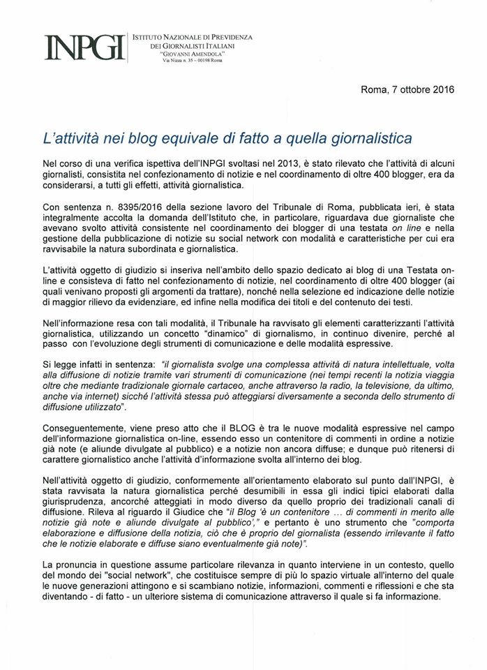 blog Pubblicato 8 ottobre 2016 su 698 × 960 in I blog sono come giornali. Lo dice il Tribunale del Lavoro. L’Inpgi ha rilevato 400 blogger inadempienti Successivo →