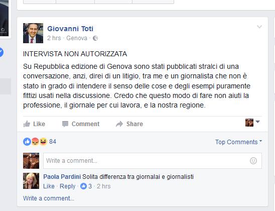 toti Pubblicato 17 dicembre 2016 su 548 × 420 in Ah, il “buco del culo di Camogli”. Il presidente della Liguria Toti accusa un giornalista di Repubblica: “Pubblicata un’intervista non autorizzata” Successivo →