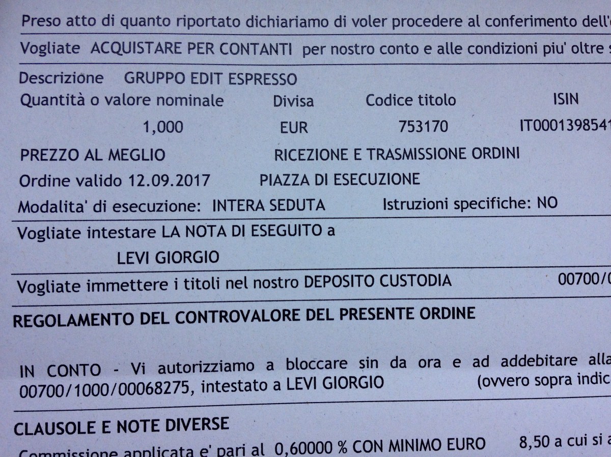 azione Pubblicato 12 settembre 2017 su 3264 × 2448 in Ho comprato un titolo di Stampubblica. Ci vediamo all’assemblea degli azionisti di Gedi ← Precedente Successivo →