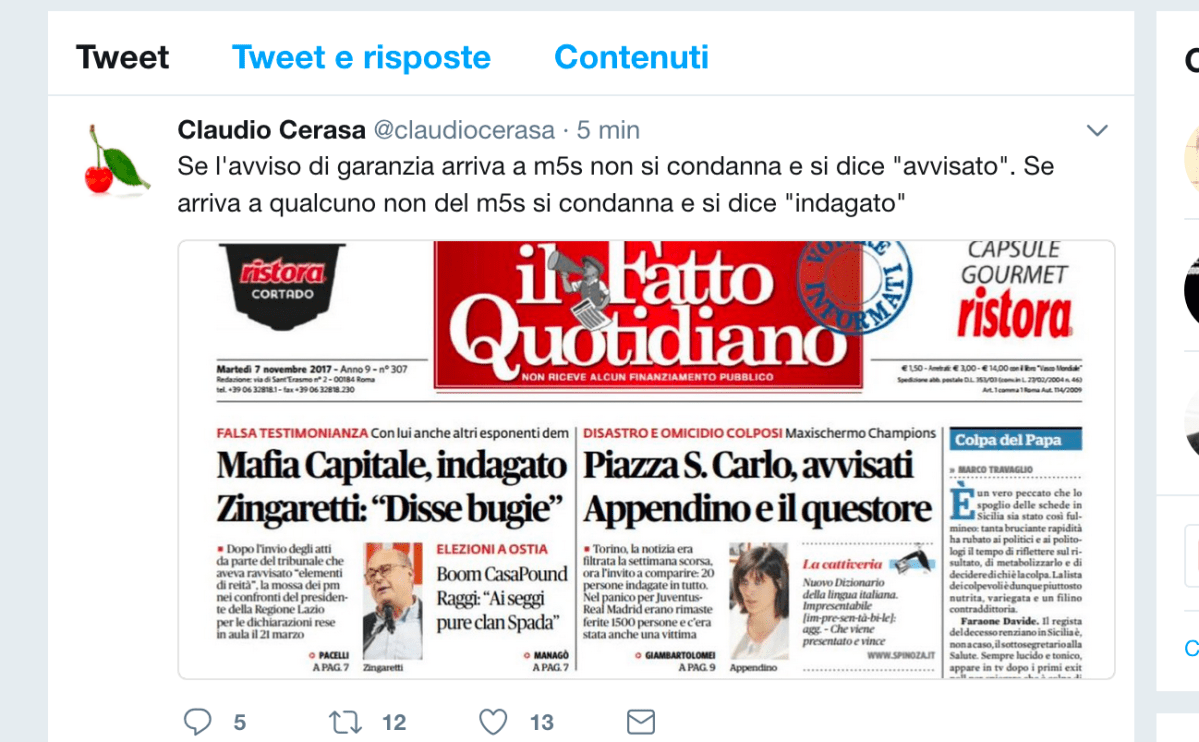 cerasa 1 Pubblicato 7 novembre 2017 su 1298 × 803 in Claudio Cerasa (Il Foglio): avvisato o indagato, Il Fatto distingue ← Precedente