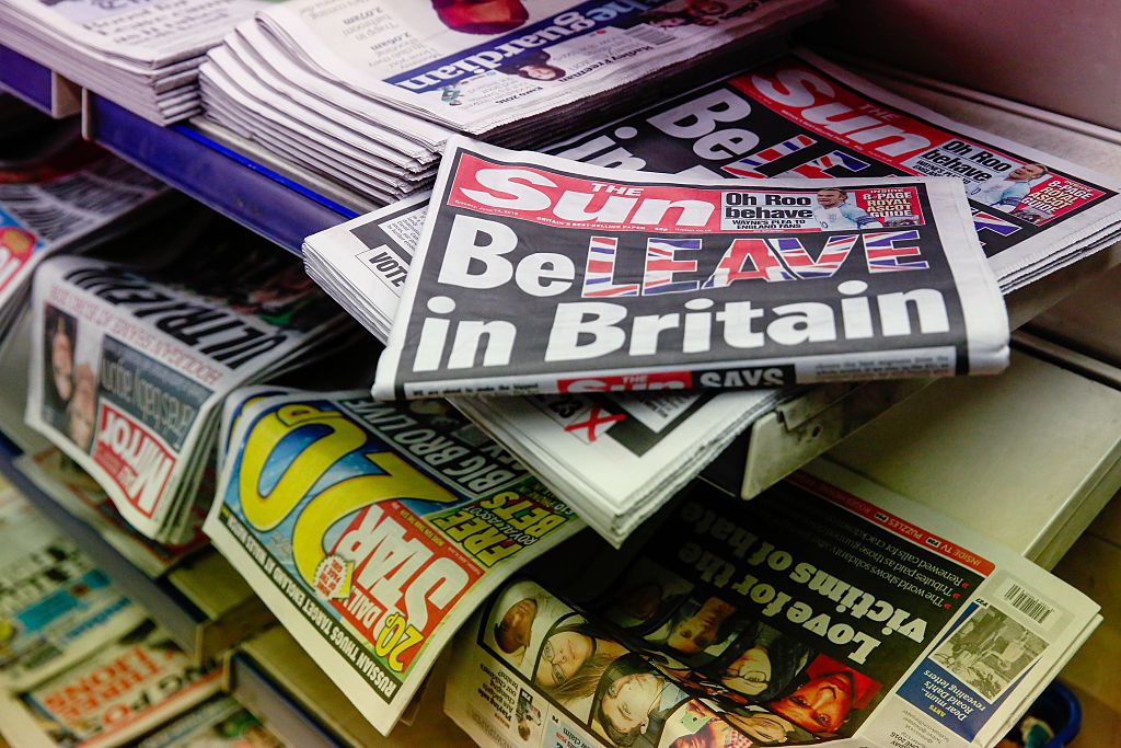 Copies of “The Sun” newspaper sit on a news stand in this arranged photograph in London, U.K., on Tuesday, June 14, 2016. The tabloid paper, published by Rupert Murdoch’s News Corp., on Tuesday urged readers to vote to leave the E.U. in the U.K.’s referendum next week. Photographer: Luke MacGregor/Bloomberg via Getty Images