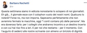 Barbara Rachetti, che è una giornalista di Donna Moderna ha postato su Facebook: “Questa settimana siamo in edicola nonostante lo sciopero di noi giornalisti. Eh già… Il giornale esce con il colophon vuoto dei nostri nomi. Qualcuno lo noterà? Forse no, ma non importa. Sapevamo perfettamente che non avremmo fermato le macchine, oggi “i conti contano più delle persone”. Ma era doveroso farlo: per i colleghi che andranno incontro a un destino incerto e con cui hai riso fino a ieri. E per noi che restiamo – per il momento. Con l’augurio di sederci alle nostre scrivanie con almeno un briciolo di dignità”.