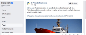 Riporta qui Lettera43 il casino che è successo oggi in Rai. Sulla pagina ufficiale Fb di RaiSport è stato condiviso un post sulla nave Aquarius de Il Primato Nazionale , la rivista dell’organizzazione di estrema destra CasaPound. L’articolo era pieno di informazioni fuorvianti e di dati non verificati. Il post è stato rimosso, dopo più di un’ora, dall’account social della televisione pubblica a seguito di numerose segnalazioni indignate.