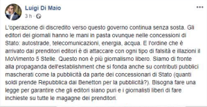 Di Maio vorrebbe liberi i giornalisti di fare inchieste sui prenditori, che nel suo linguaggio dovrebbero essere gli editori stessi. Tuttavia, non funziona così. I giornalisti sì, sono qui per fare inchieste, che oggi soprattutto sono indirizzate alla politica, sugli uomini che ci governano, sulle follie sovraniste e sugli slogan come questo post pubblicato su Fb. Qualcuno la verità la deve raccontare e non sarà certo Di Maio a impedirlo con una leggina che persino Mussolini giornalista avrebbe guardato storta. Per la sua stupidità.