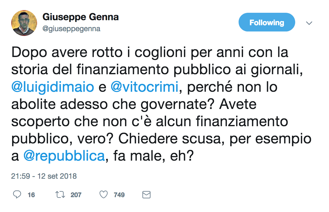 genna Pubblicato 13 settembre 2018 su 1110 × 714 in “Avete rotto i coglioni per anni e adesso avete scoperto che non c’è alcun finanziamento pubblico. Chiedere scusa a Repubblica no?” Successivo →