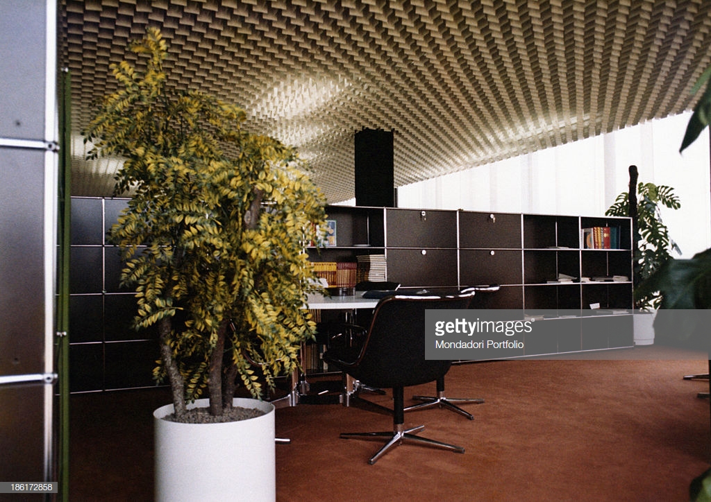 The interior of the newly built Mondadori headquarters, with a countertop which decomposes the light propagation and hides the sound absorbing panels and the air conditioning systems over the open space offices like this one; the project is by the great Brazilian architect Oscar Niemeyer. Segrate (MI), Italy, the ’70s. (Photo by Mondadori Portfolio via Getty Images)