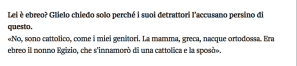 La seconda. L’intervistatore aggiusta un po’ il tiro e dice glielo chiedo solo perché i suoi detrattori l’accusano anche di questo. Da quando circola il nome di Foa alla presidenza della Rai io non ho letto da nessuna parte che ci sia uno schieramento di detrattori che storcono il naso sulla presunta appartenenza alla religione ebraica. Nè a destra, nè a sinistra. E poi chi sarebbero questi detrattori, il Pd?