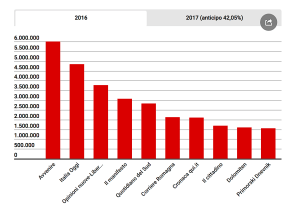 Le cooperative. Al primo posto c’è Il tiraccio giornale che fa capo ad una coop calabrese che si chiama Gesc. In seconda posizione c’è Famiglia Cristiana, l’unico periodico a tiratura nazionale di questa categoria. Il settimanale cattolico ha incassato 312 mila euro per il 2016 e 131.196 come anticipo del 42,05% per il 2017. Seguono Il Biellese, La Guida, L’Eco del Chisone, Il Giornalino, Il Nuovo Torazzo, L’Amico del Popolo, La Vita del Popolo, Verona Fedele, Il Cesenate, Missionari Saveriani, Verona fedele, Il mucchio selvaggio.