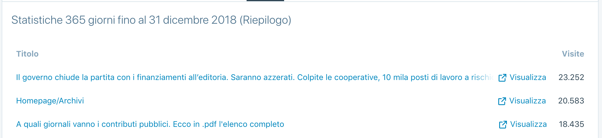 blog Pubblicato 31 dicembre 2018 su 2102 × 483 in Nel 2018 i post pubblicati su questo blog sono stati 277 (72.680 parole). Con punte di 23 mila lettori ad articolo ← Precedente Successivo →