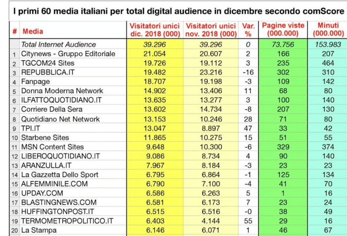 classifica Pubblicato 1 febbraio 2019 su 1321 × 900 in Classifica informazione online a dicembre. Repubblica al 3° posto. Corriere al 7°. La Stampa non va oltre la 20° posizione. Quotidiani Gedi 22°