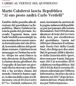 Il secondo quotidiano del gruppo, ovvero La Stampa, non ignora la notizia, ma la pubblica sbagliata, o meglio girata secondo le esigenze della Casa Madre e titola: “Calabresi lascia Repubblica”. E invece di riportare una fonte ufficiale del gruppo, fa riferimento al lancio dell’Ansa. Insomma è l’Ansa che ha detto che Calabresi è andato via di sua spontanea volontà. Noi che ci possiamo fare?