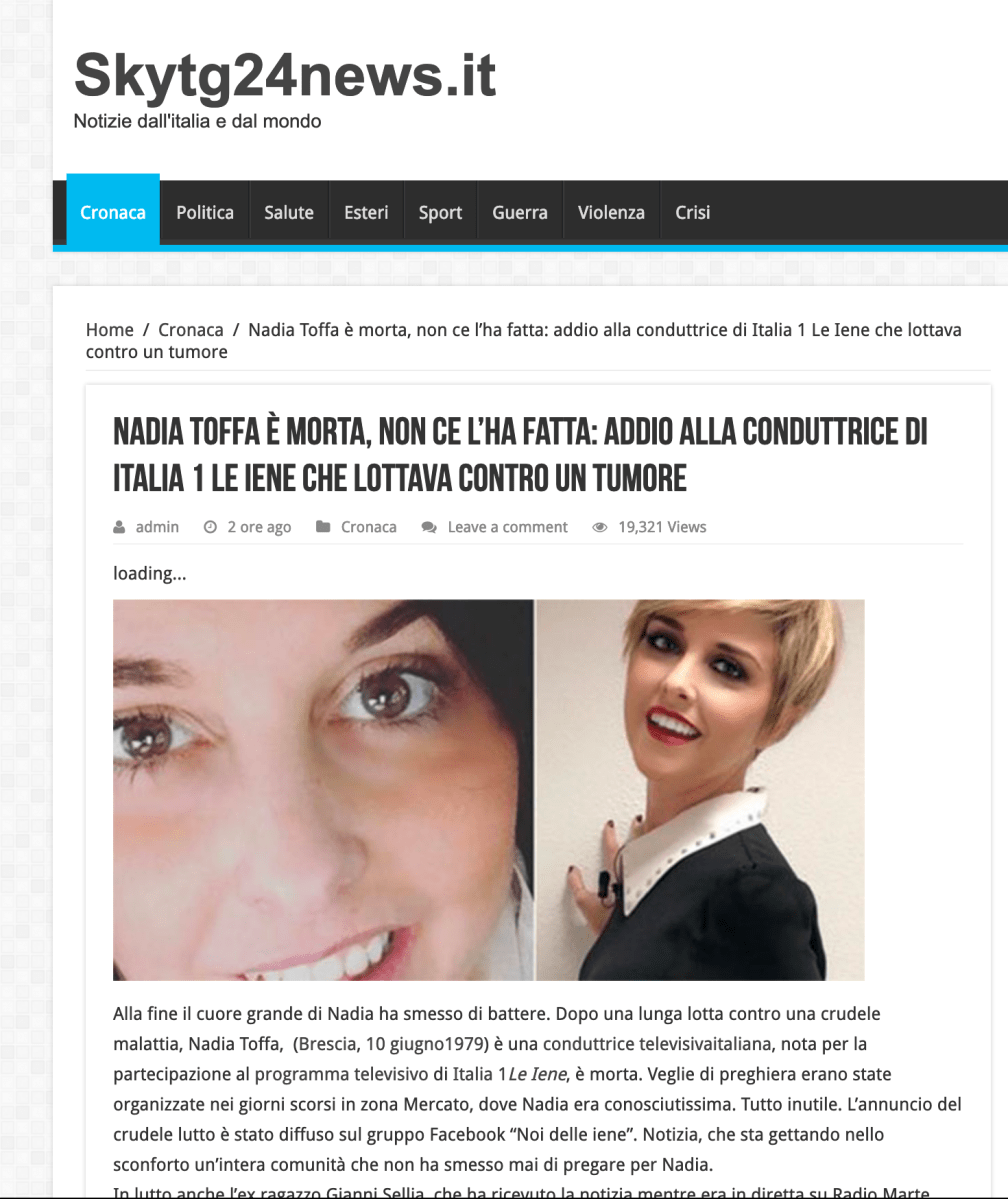 toffa Pubblicato 12 marzo 2019 su 1470 × 1748 in Nadia Toffa è morta. La macabra fake news diffusa dal sito bufala SkyTg24 Successivo →