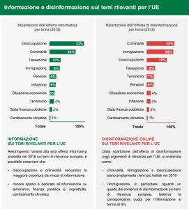 Secondo il report, criminalità, immigrazione e disoccupazione sono stati i temi più trattati dai siti disinformazione nell’ultimo anno. Immigrazione e terrorismo hanno segnato la maggiore presenza di disinformazione sul totale dei contenuti online prodotti sui singoli argomenti, riportando quote rispettivamente pari al 15% e all’11%.