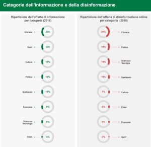 Nel 2018, la disinformazione in Italia ha interessato l’8% dei contenuti informativi online prodotti mensilmente ed ha riguardato soprattutto argomenti di cronaca e politica (nel 53% dei casi) e notizie di carattere scientifico (18% dei contenuti di disinformazione).
