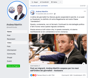 Il giornalista pubblicista Andrea Manfrin, e capogruppo della Lega Vallée d’Aoste in consiglio regionale, è stato sospeso dalla professione giornalistica su decisione del Consiglio di disciplina territoriale dell’Ordine della Valle d’Aosta.