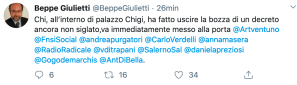 Scrive su Twitter Beppe Giulietti, presidente di Fnsi: “Chi all’interno di palazzo Chigi ha fatto uscire la bozza di un decreto ancora non siglato va immediatamente messo alla porta”.