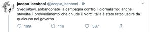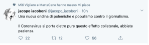 E’ possibile che stamattina siano volate le stoviglie a Palazzo Chigi. Ma Jacopo Iacoboni (La Stampa) invita a sdrammatizzare con un tweet il corto circuito istituzionale: “Una nuova ondina di polemiche e populismo contro il giornalismo. Il coronavirus si porta dietro pure questo effetto collaterale, abbiate pazienza”. E aggiunge in un altro commento: “Svegliatevi abbandonate la campagna contro il giornalismo. Anche stavola il provvedimento è stato fatto uscire da qualcuno del governo”.