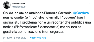Il commento più benevolo invitava la gente a randellare i giornalisti, colpevoli da due settimane di essere i seminatori di questo generale panico che morde le chiappe a tutti. Ieri sera poi l’ira dei social si è accentrata sulla giornalista del Corriere della Sera Fiorenza Sarzanini che per prima sull’edizione online del suo giornale ha diffuso la bozza del decreto del governo, realtivo ad un altro giro di vite nelle zone dove il virus ha colpito più duramente.