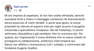 Se ne va da La Repubblica anche Gad Lerner, spiega il perché con un post sul suo profilo Facebook. A pochi giorni dall’abbandono qui di Enrico Deaglio.