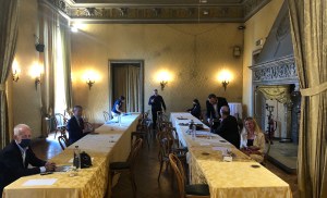 Come si può vedere le distanze sono state ampiamente rispettate. La location è la Sala Toniolo del Circolo della Stampa a Palazzo Ceriana Mayneri. Detta anche Sala del Camino, alla vostra destra.
