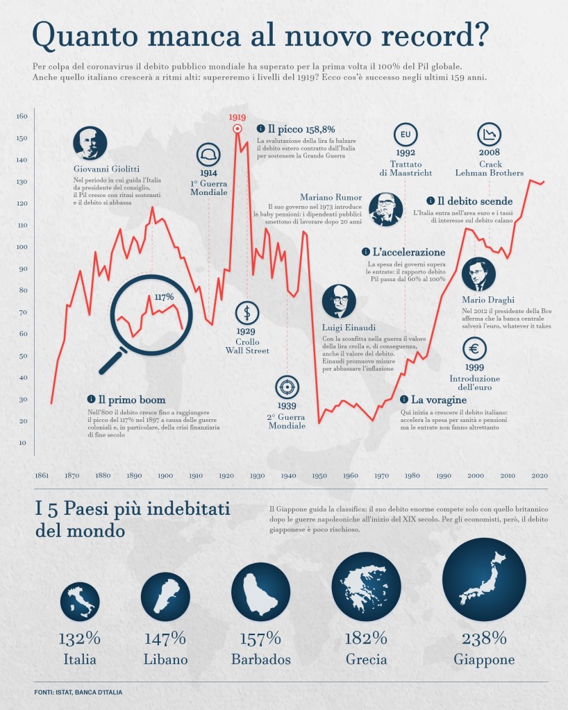 “Il rapporto tra debito pubblico e Pil italiano raggiungerà il 158% alla fine del 2020. Per capire quanto questo anno sia complicato per l’economia italiana non c’è bisogno di grandi numeri, ma basti sapere che il rapporto debito-Pil nella storia era arrivato a questo livelli solo una volta: nel 1919 (158,8%).
