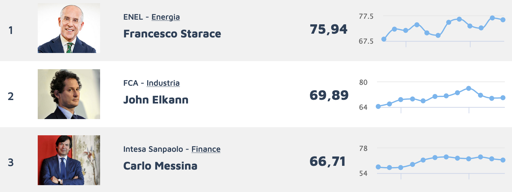 Al primo posto ancora l’ad di Enel Francesco Starace (75,94). Poi John Elkann (69,89) nominato di recente presidente del cda di Stellantis. Terzo l’ad di Intesa Sanpaolo Carlo Messina (66,71).