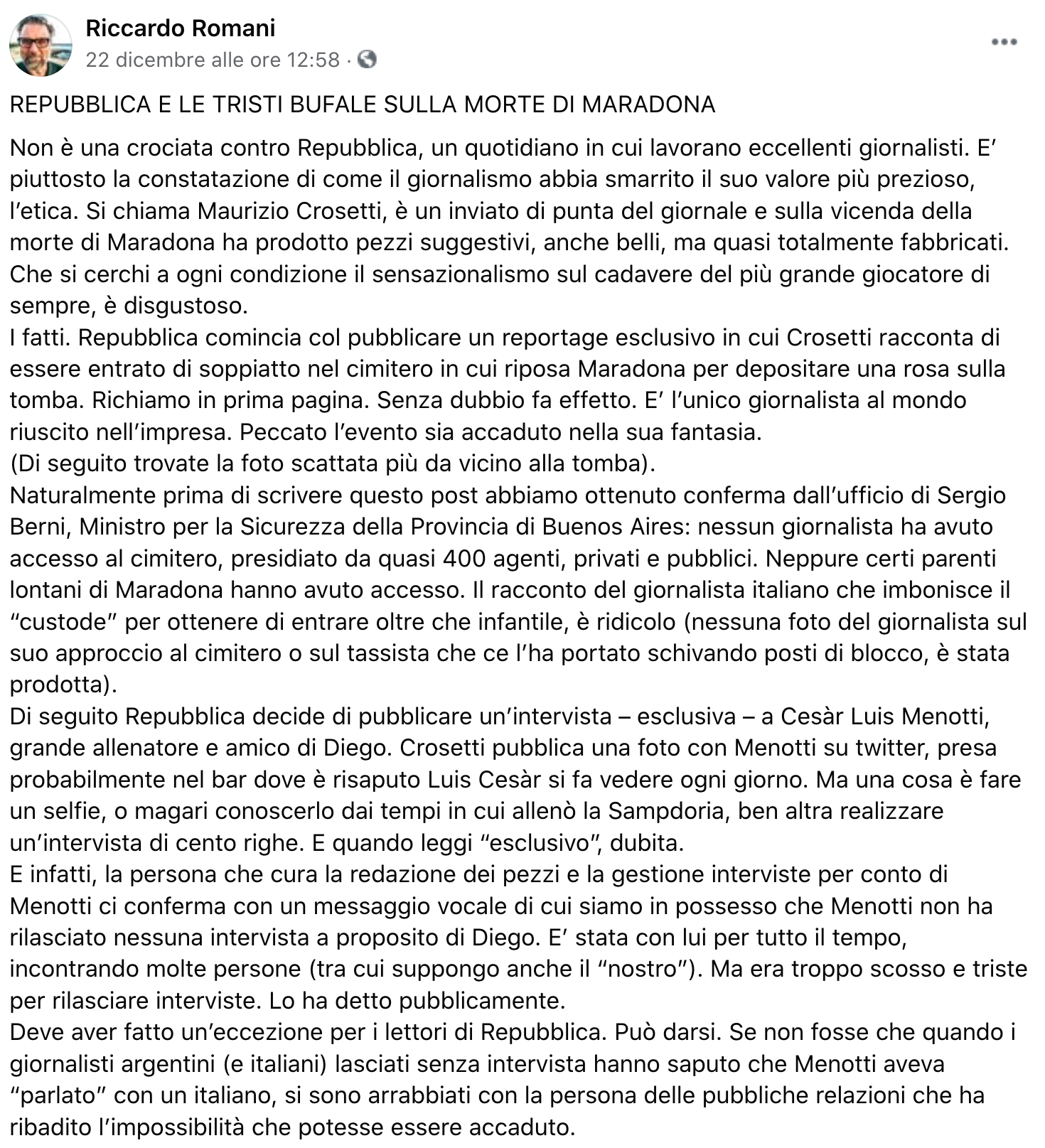 I fatti. Repubblica comincia col pubblicare un reportage esclusivo in cui Crosetti racconta di essere entrato di soppiatto nel cimitero in cui riposa Maradona per depositare una rosa sulla tomba. Richiamo in prima pagina. Senza dubbio fa effetto. E’ l’unico giornalista al mondo riuscito nell’impresa. Peccato l’evento sia accaduto nella sua fantasia.(Di seguito trovate la foto scattata più da vicino alla tomba).Naturalmente prima di scrivere questo post abbiamo ottenuto conferma dall’ufficio di Sergio Berni, Ministro per la Sicurezza della Provincia di Buenos Aires: nessun giornalista ha avuto accesso al cimitero, presidiato da quasi 400 agenti, privati e pubblici. Neppure certi parenti lontani di Maradona hanno avuto accesso. Il racconto del giornalista italiano che imbonisce il “custode” per ottenere di entrare oltre che infantile, è ridicolo (nessuna foto del giornalista sul suo approccio al cimitero o sul tassista che ce l’ha portato schivando posti di blocco, è stata prodotta).Di seguito Repubblica decide di pubblicare un’intervista – esclusiva – a Cesàr Luis Menotti, grande allenatore e amico di Diego. Crosetti pubblica una foto con Menotti su twitter, presa probabilmente nel bar dove è risaputo Luis Cesàr si fa vedere ogni giorno. Ma una cosa è fare un selfie, o magari conoscerlo dai tempi in cui allenò la Sampdoria, ben altra realizzare un’intervista di cento righe.