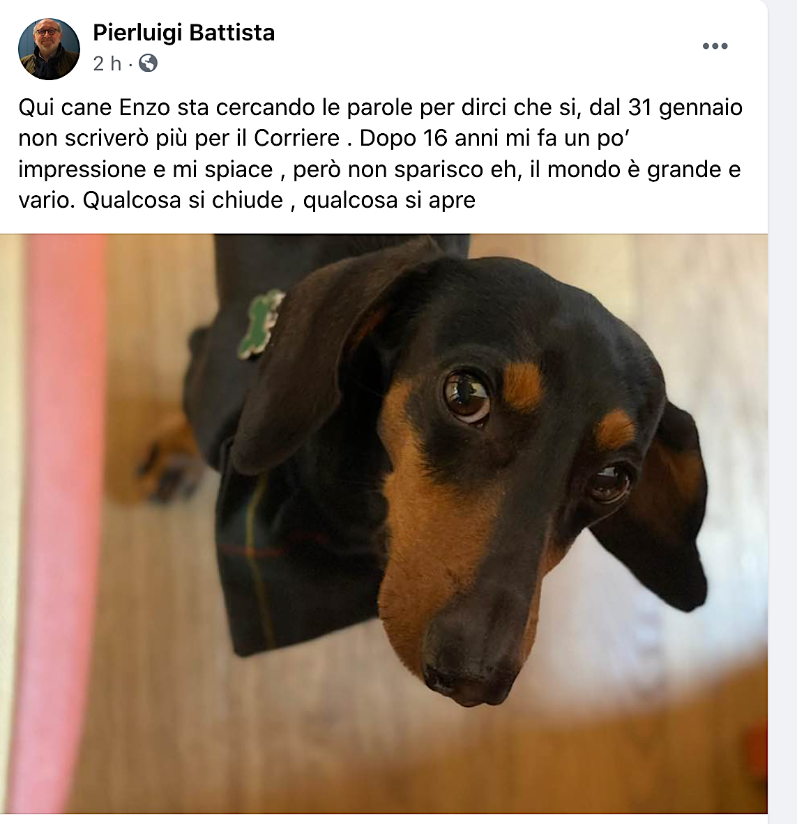 Pubblica la foto del suo cane e scrive: “Qui cane Enzo sta cercando le parole per dirci che si, dal 31 gennaio non scriverò più per il Corriere . Dopo 16 anni mi fa un po’ impressione e mi spiace , però non sparisco eh, il mondo è grande e vario. Qualcosa si chiude , qualcosa si apre”.
