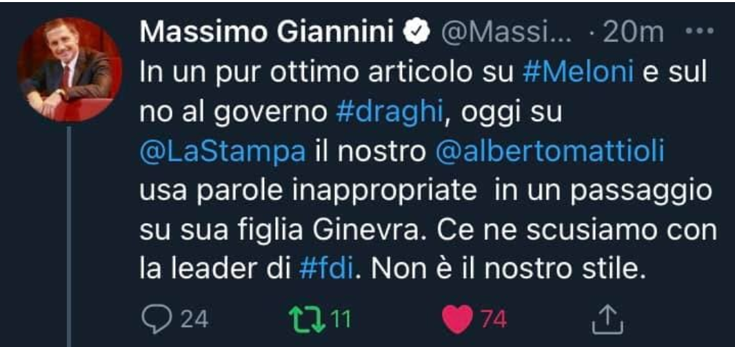 Allo shitstorm mediatico si è aggiunta l’indignazione giustificata della destra politica e quella un po’ meno plausibile dell’innocente Giornale che ha gettato altra benzina sul fuoco. E forse di altri giornali che non visto. Ma quello che stupisce sono le scuse del direttore de La Stampa Massimo Giannini: “Il nostro Alberto Mattioli usa parole inappropriate in un passaggio su sua (di Meloni, ndr) figlia Ginevra. Ce ne scusiamo con la leader di Fdl, non è il nostro stile”. Ma lo stile non dovrebbe corrispondere alla linea del giornale?