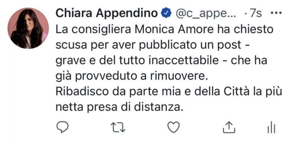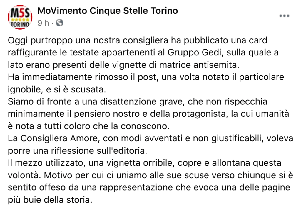 Che curiosa la consigliera Monica Amore del M5S. Prima pubblica sul suo profilo social un orrendo messaggio antisemita e poi si scusa. Si scusa anche la sindaca di Torino Appendino.