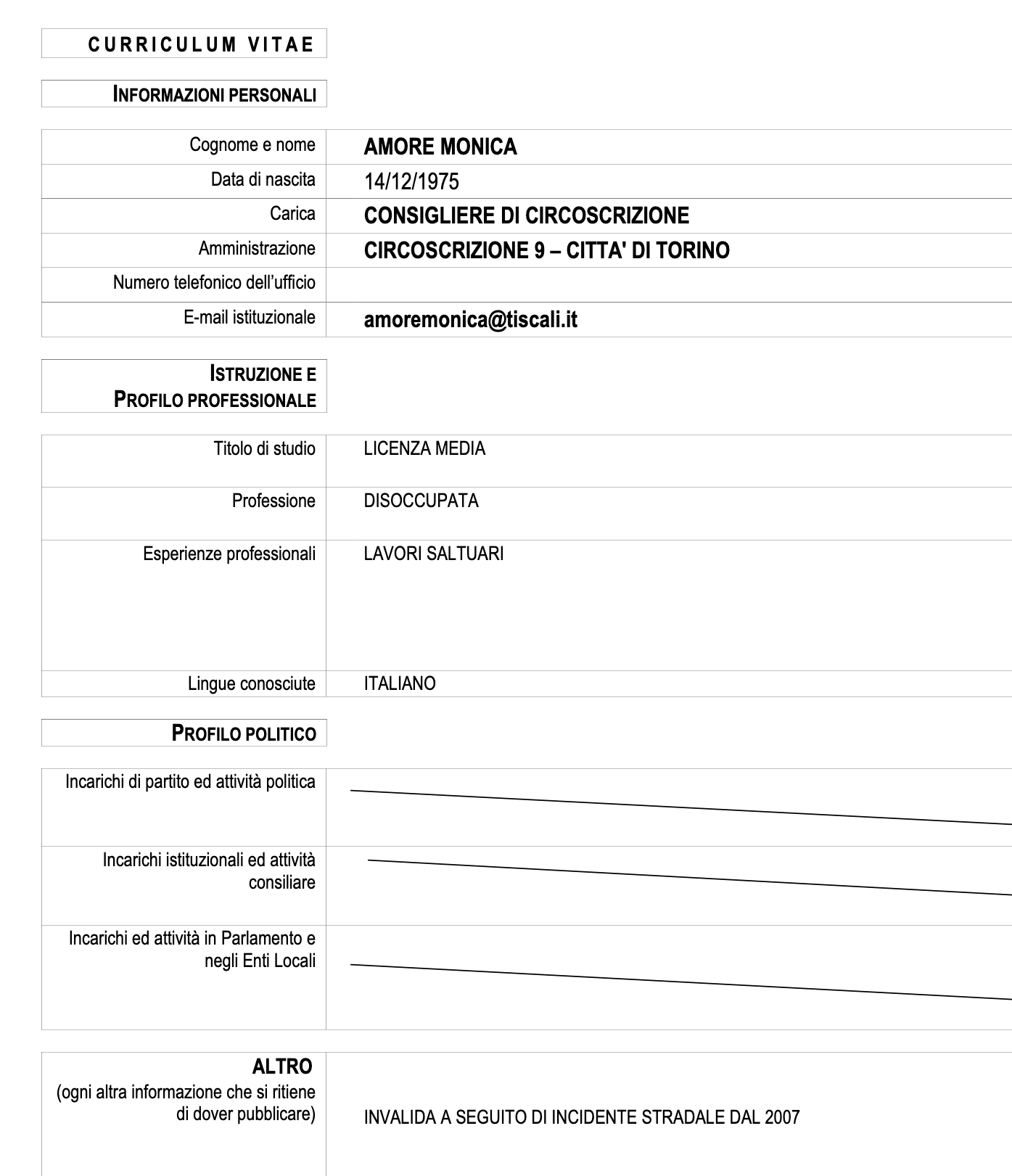 Il suo curriculum dice che ha 46 anni. Titolo di studio: licenzia media. Professione: disoccupata. Esperienze professionali: lavori saltuari. Lingue conosciute: italiano. Profilo politico: ?