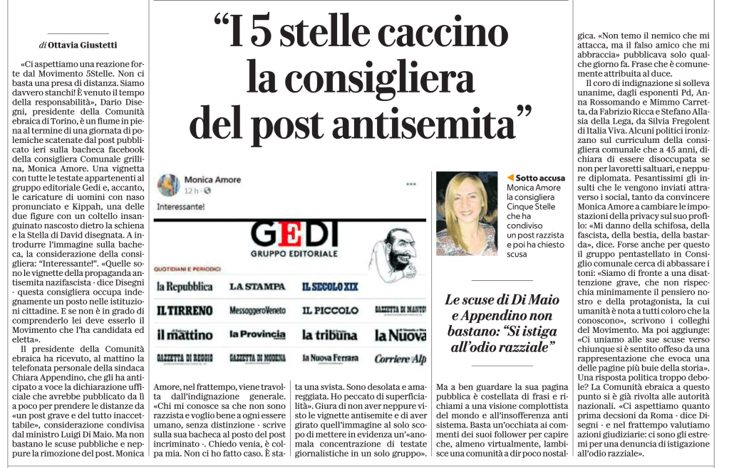 Riporto solo oggi (per non sottrarre lettori al giornale) il pezzo uscito ieri su Repubblica. Dove si legge che il presidente della Comunità Ebraica di Torino Dario Disegni ha esortato il M5S a chiedere ad Amore di dimittersi da consigliera comunale. Richiesta caduta nel vuoto, a quanto pare. La sindaca Appendino e persino il ministro (sic) degli Esteri Di Maio hanno stigmatizzato l’episodio. E anche in questo caso, signori miei ci mancherebbe altro. Ma di dimissioni non se ne parla.