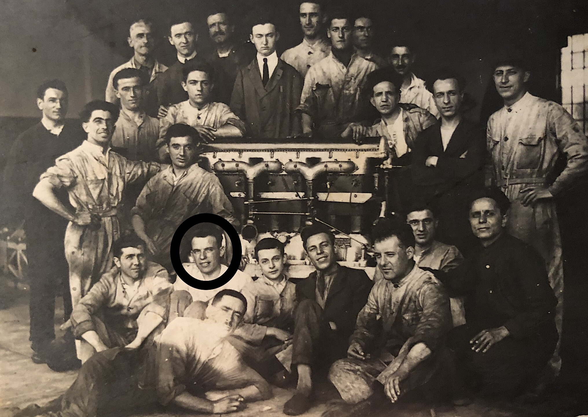 L’uomo in basso in questa fotografia è mio nonno Giovanni Giuanin Sesia, il papà di mia mamma. Al centro dell’immagine un gigantesco motore di aereo. La foto è stata scatta presumibilmente nel 1919. Dunque, 102 anni fa.