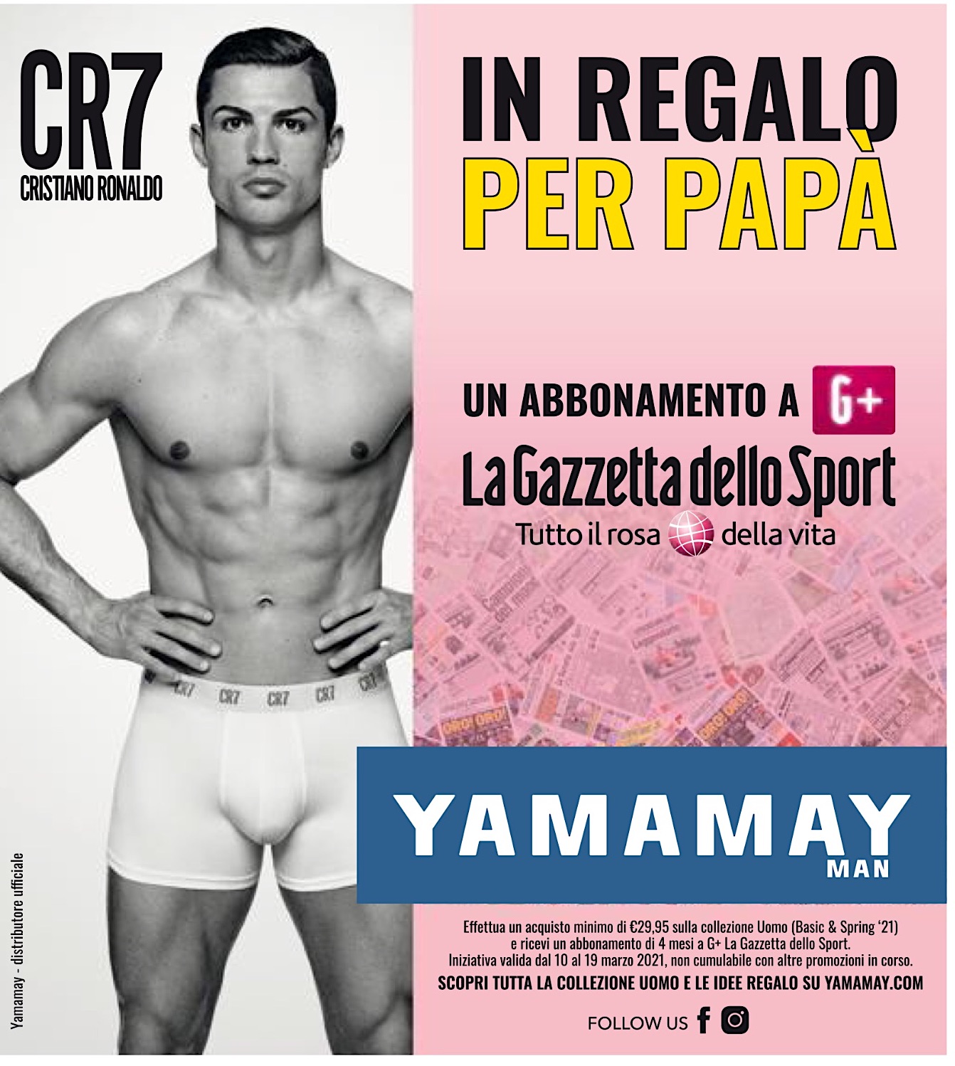 Lo segnala oggi la newsletter Charlie del Post. Ma i lettori della Gazza già lo sanno. Per la settimana della Festa del papà, chi faccia acquisti da 30 euro di intimo maschile nei negozi Yamamay potrà avere un abbonamento valido per quattro mesi alla Gazzetta dello Sport. Yhuuu.
