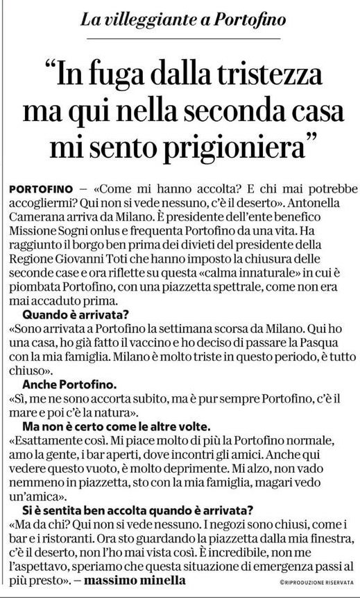 E’ finita su Repubblica per puro caso, perché qualcuno in redazione aveva il suo numero di telefono nell’agenda e ha detto al giornalista: senti un po’ sta qui che ha la villa a Portofino e chiedile come ha trascorso la pandemia a Milano. Così, hanno rimediato una pessima figura il giornale, che ha dato voce una signora snob dell’alta borghesia su un tema che sta trascinando alla povertà il Paese, e la signora Camerana che in fondo fa benissimo a vivere il lockdown nella sua pregevole casa di Portofino. La ricchezza non è ancora una colpa.