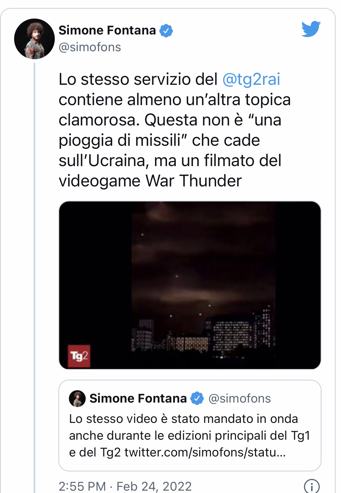 Complimenti al TG2. Nell’edizione pomeridiana il telegiornale ha trasmesso un video indicando le immagini come “pioggia di missili sull’Ucraina”. In realtà si trattava di uno spezzone del videogioco War Thunder.