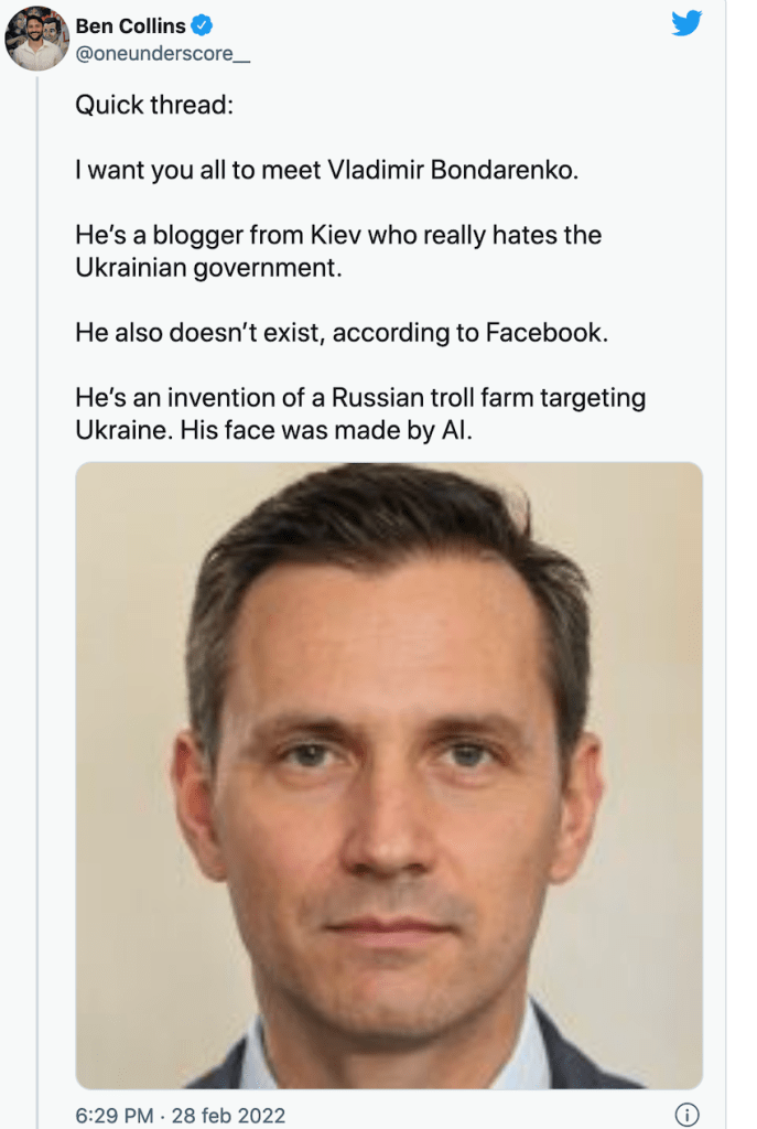 Ma c’è un piccolo dettaglio. Bondarenko e Kerimova non esistono. Sono stati costruiti da una intelligenza artificiale voluta dalla propaganda anti-Ucraina di Puntin. Lo ha scoperto Ben Collins, giornalista della Nbc che ha denunciato la clamorosa fake news su Twitter. Collins ha scannerizzato al dettaglio le due immagini. C’è un particolare visibile anche così: le orecchie innaturali dell’uomo in fotografia.