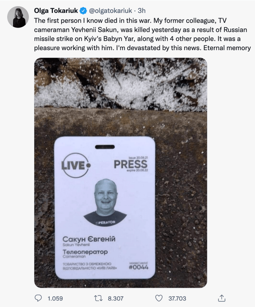 Lo ha annunciato su Twitter la giornalista ucraina freelance Olga Tokariuk: “La prima persona che conosco è morta in questa guerra. Il mio ex collega, il cameraman della Tv Yevhenii Sakun, è stato ucciso ieri a seguito di un attacco missilistico russo sulla Baby Yar di Kiev, insieme ad altre 4 persone. È stato un piacere lavorare con lui. Sono devastata da questa notizia. Memoria eterna”.