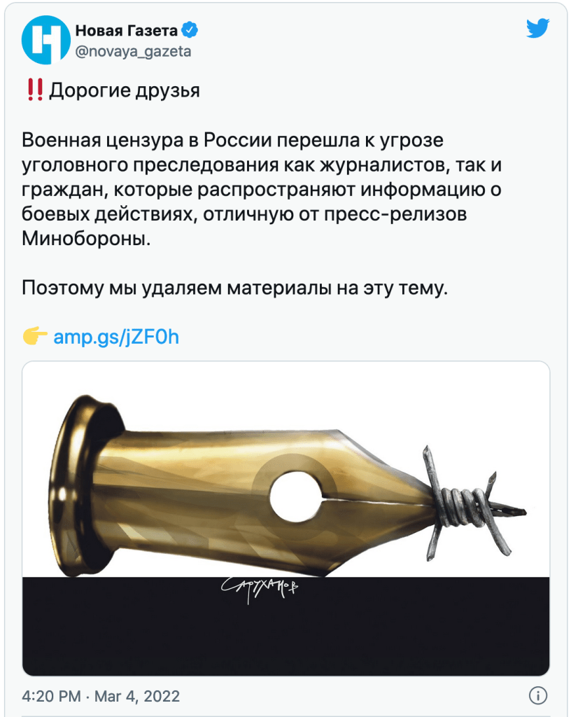 Anche le testate giornalistiche Deutsche Welle, Meduza e Radio Liberty potrebbero uscire dai confini russi. Giovedì una delle ultime testate giornalistiche indipendenti Tv Rain ha interrotto le trasmissioni dopo essere stata sottoposta a pressioni per le news trasmesse sull’invasione dell’Ucraina. Il canale ha così mandato in onda una regsitrazione del Lago dei Cigni di Ciajkovskij. Il quotidiano Novaya Gazeta con un tweet in russo ha detto di aver rimosso tutti i servizi sulla guerra, dopo che i suoi giornalisti sono stati minacciati dalle autorità.