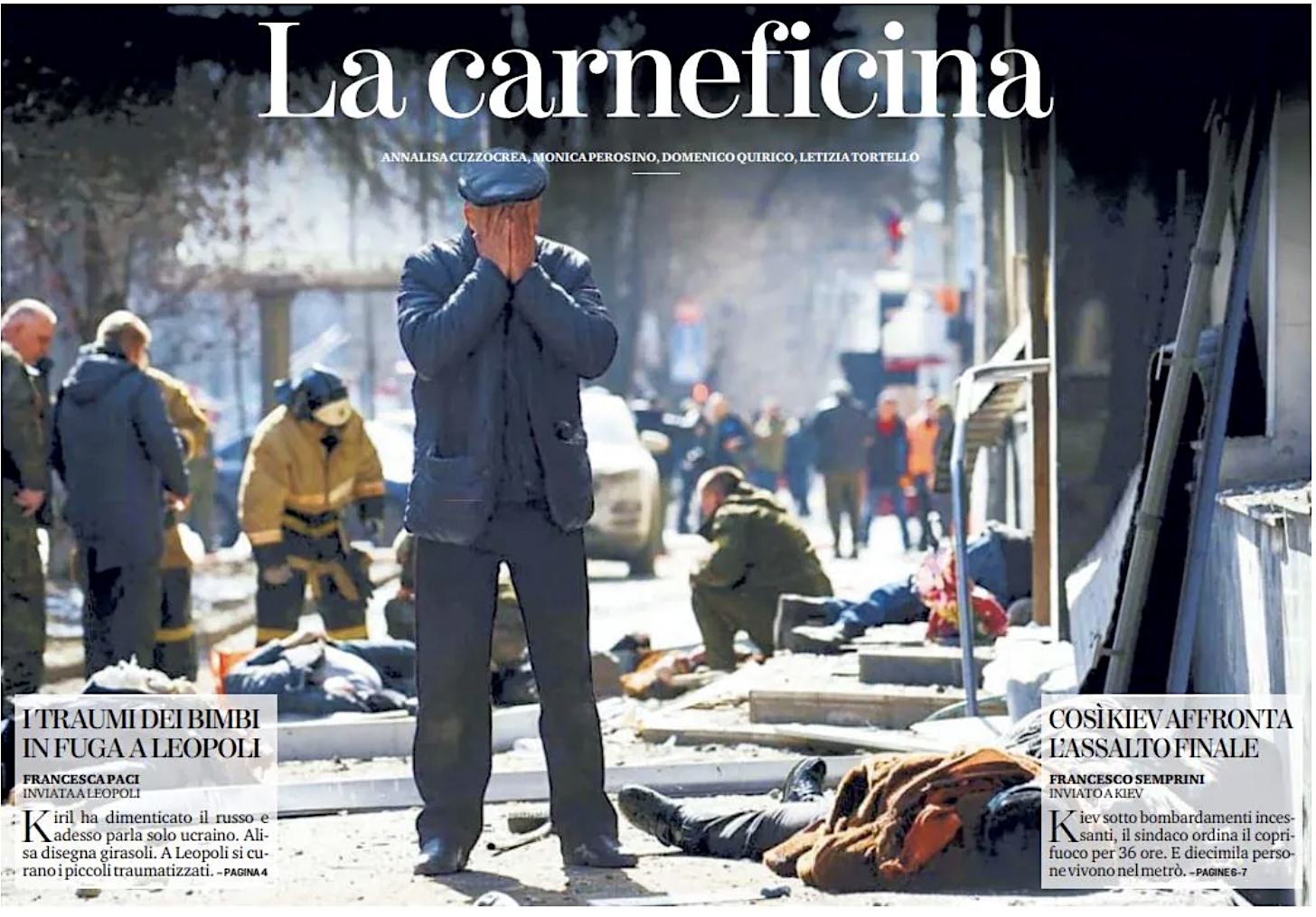 Tutto comincia da questa foto, uscita in prima pagina su La Stampa. Il titolo La Carneficina è eloquente. L’immagine è terribile. Si notano un uomo con le mani sugli occhi e corpi di gente distesa a terra. Braccia mutilate, arti smembrati, morti, urla di dolore che pare di sentire. L’immagine vuole raccontare la tragedia del popolo ucraino, martoriato dalle truppe di Putin. Tuttavia, c’è un dettaglio che non quadra. Quei morti non sono ucraini ma si tratta di 23 civili filorussi, caduti sotto le schegge di un missile Tochka-U abbattutosi nelle strade centrali di Donetsk, la capitale di una delle due repubbliche separatiste. Notizia della quale La Stampa non ha dato conto.