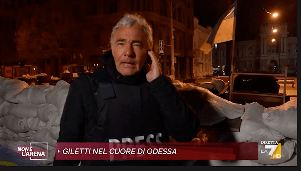 Ho pensato, adesso viene fuori Stanley Kubrick e dice che non gli piace il dettaglio di quell’albero là in fondo. Invece, chi ti vedo? Massimo Giletti, in mezzo ad una strada di Odessa, in una inquadratura perfetta, da film di guerra. Com’è andata che Giletti era a Odessa è riportato su tutti i giornali di oggi.