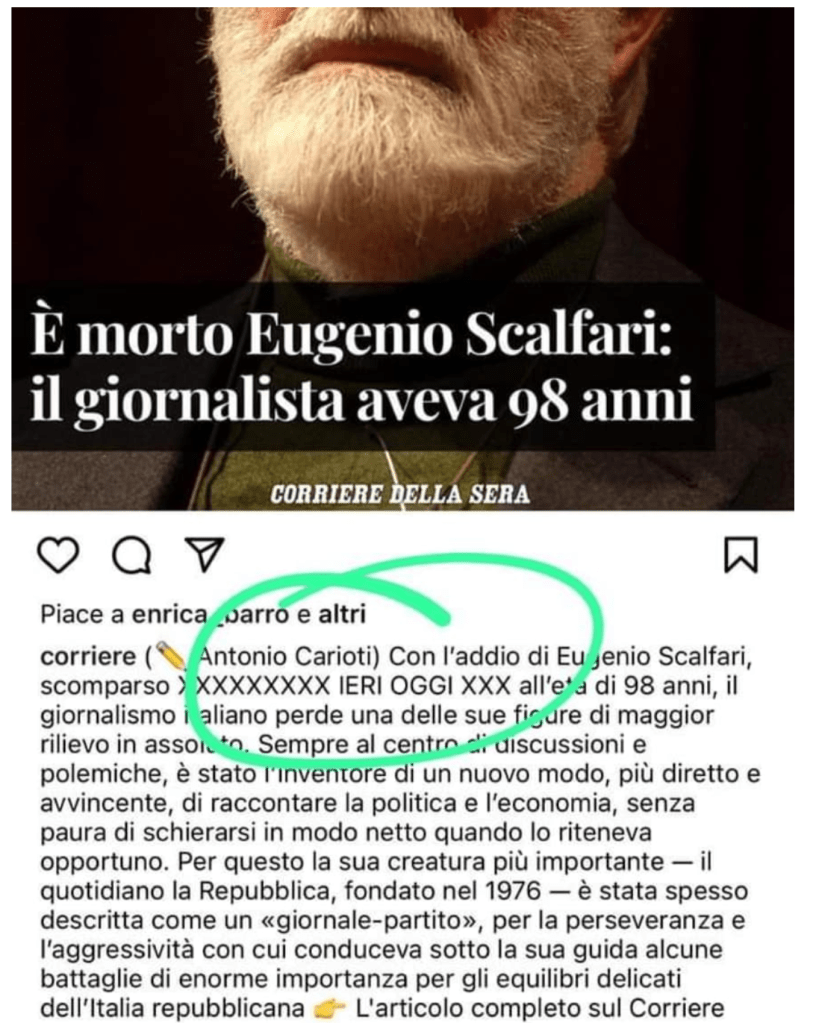 La prima cosuccia è la gaffe de Il Corriere della Sera che ha maldestramente annunciato la morte di Eugenio Scalfari pubblicando sul Instagram il coccodrillo che avevano da parte. C’è rimasto pochi secondi, quanto basta però agli screenshiottisti di professione d’immortalare la cazzata. Ok, capita. Scalfari però ha 98 anni e non sta tanto bene. Speriamo che nessuno glielo abbia detto. O magari sì, si dice che porti fortuna.