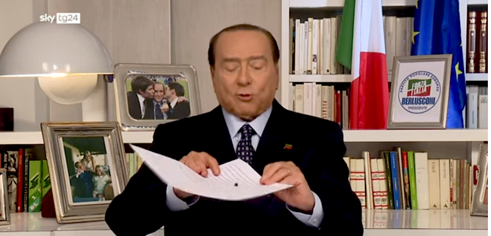 Mi ero perciò infilato in un loop e volevo uscire al più presto da questa visione ipnotica a due sensi. Così, ho chiuso gli occhi e ho ascoltato quello che Berlusconi (non Crozza) aveva da dire. Ora, con tutto il rispetto e la simpatia che ho per i bravissimi autori di Maurizio Crozza (e qui li cito, ma forse c’è qualcun altro che mi sfugge: Andrea Zalone, Francesco Freyrie, Vittorio Grattarola, Alessandro Robecchi, Alessandro Giugliano, Claudio Fois, Gaspare Grammatico), un testo con così tante cazzate dentro, panzane giganti, così ridicolo, così idiota non l’avevo mai sentito. Il team di Crozza proverà a farne una parodia, ma sarà difficilissimo superare l’originale.