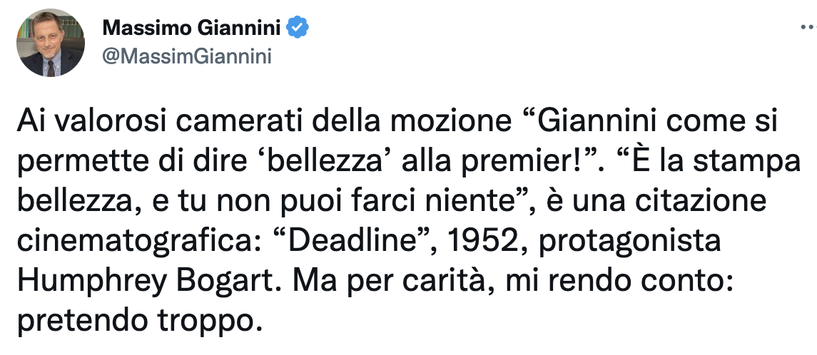 Era tutto molto semplice. Chi fa questo mestiere sa benissimo che la frase E’ la stampa, bellezza è stata usata migliaia di volte per i più svariati argomenti. Moltissimo nei titoli di giornale: E’ il calcio, bellezza oppure E’ l’economia, bellezza o volendo E‘ il potere delle banche, bellezza. La Treccani dice: “E’ una delle battute più note nella storia del cinema”. E’ la stampa, bellezza è pure il titolo di un libro di Giorgio Bocca per Feltrinelli.
