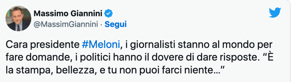 Il direttore de La Stampa Massimo Giannini ha replicato con questo tweet all’indignazione fuori luogo di Meloni.
