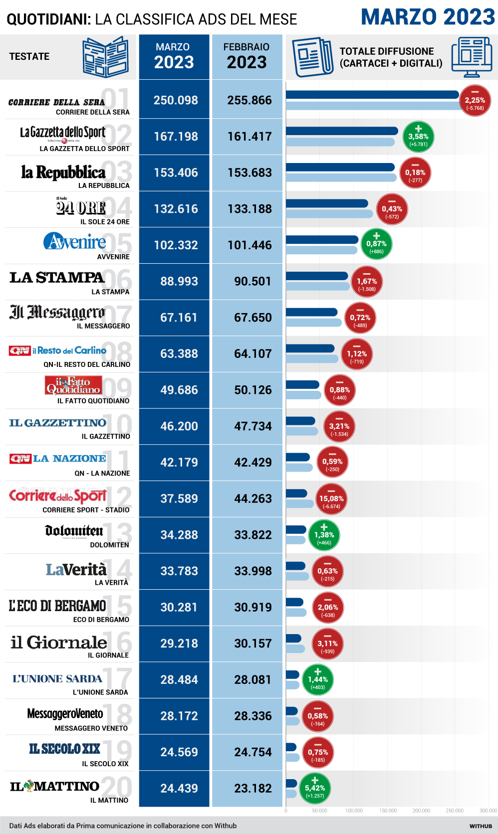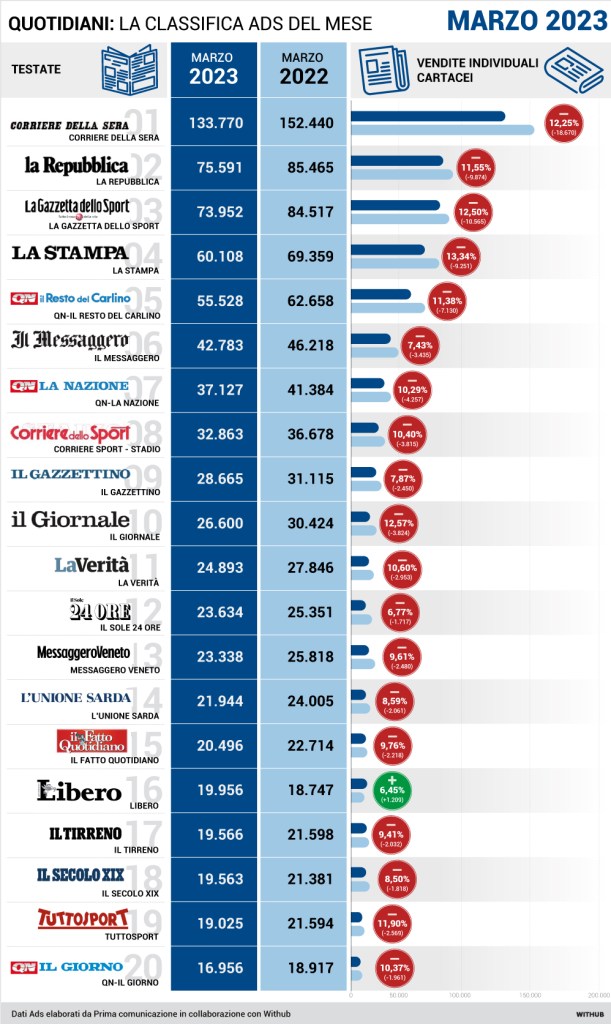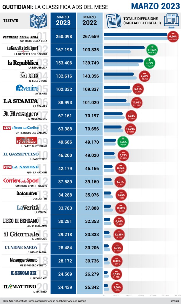 Queste le tabelle di vendita dei quotidiani solo carta e carta+digitale pubblicate qui da Prima On Line. Si riferiscono per diffusione+digitale a marzo 2023 su febbraio 2023. Anno su anno a marzo 2023 su 2022. Vendite quotidiani a marzo 2023 su marzo 2022.