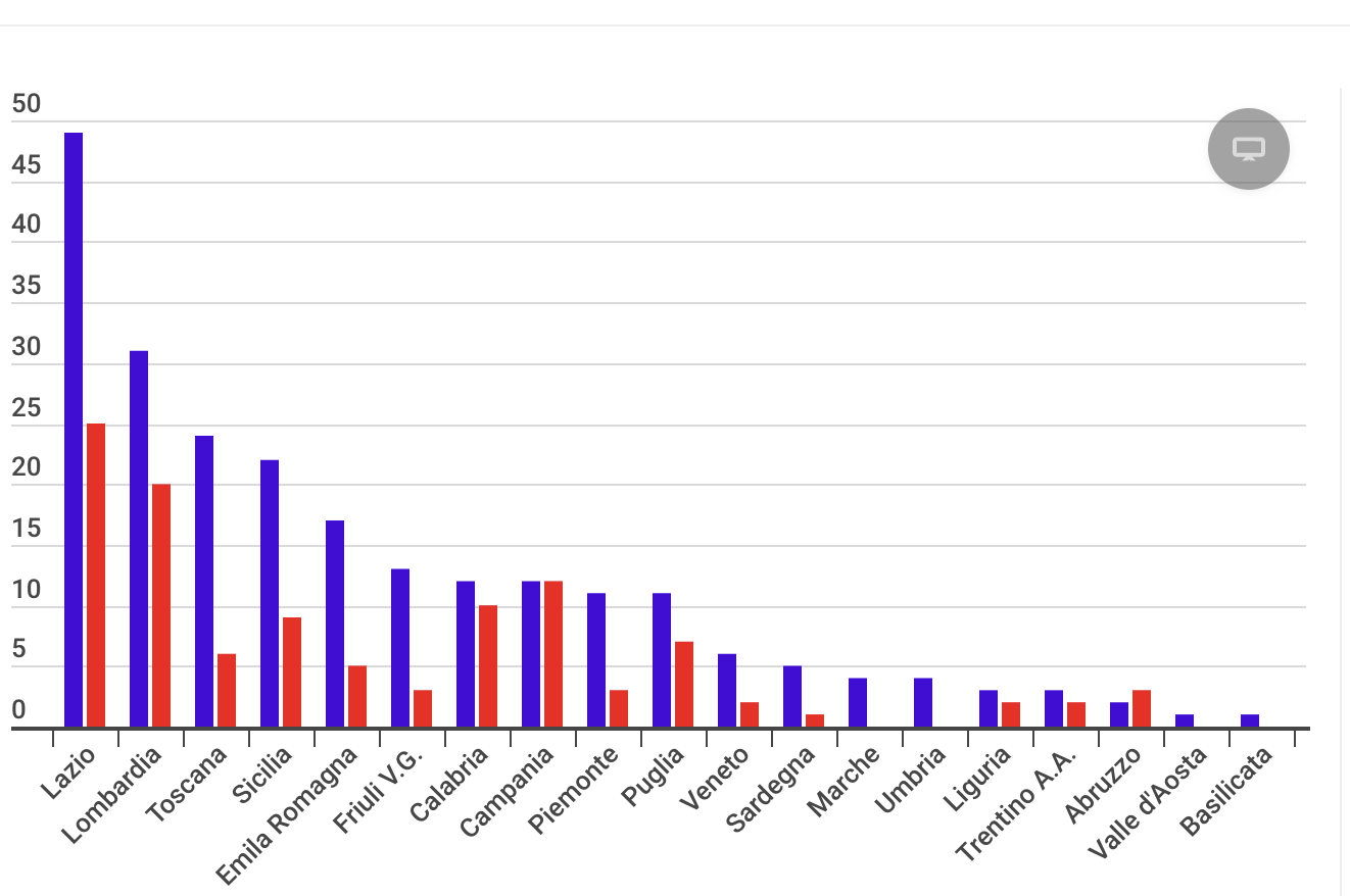 Nel 2021 le minacce complessive sono state 232 scese a 111 nel 2022 pari al 52% in meno. Il grafico sopra mostra il numero di minacce ricevute da professionisti dell’informazione suddivise per Regione di residenza. Ovviamente in testa a questa classifica ci sono le Regioni nelle quali si concentrano la maggior parte delle testate giornalistiche in Italia e cioè Lazio e Lombardia. Tra i due territori il Lazio batte, sia nel 2021 che nel 2022, la Lombardia. Nel 2021 i giornalisti laziali hanno ricevuto 49 minacce scese a 25 nel 2022. I giornalisti lombardi, invece, rispettivamente, 31 e 20. La terza regione con il maggior numero di giornalisti minacciati è stata, nel 2021, la Toscana con 24 professionisti intimiditi mentre nel 2022 al terzo posto è andato alla Campania con 12. Tra l’altro il 2021 ha segnato una crescita degli atti intimidatori del 42% rispetto al 2020 quando ne sono stati registrati 163.