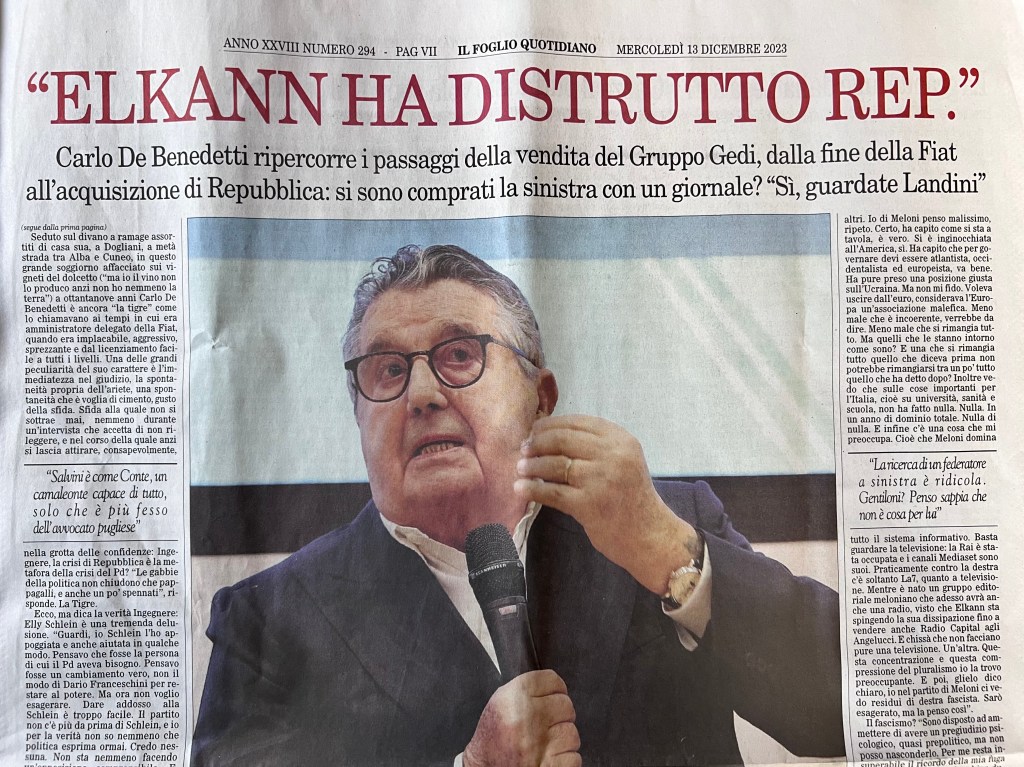 Dice bene Merlo: “Una delle sue peculiarità è l’immediatezza del giudizio, la spontaneità propria dell’ariete”. Infatti, De Benedetti non fa sconti e sul capitolo Fiat e Gedi prende a cornate John Elkann: “E’ riuscito in quattro anni a distruggere il gruppo editoriale che il principe Carlo Caracciolo, suo prozio, aveva creato in circa quindici anni. Un massacro incomprensibile per i suoi scopi. John ha venduto tutti quotidiani locali, che andavano bene. Poi ha devastato pure Repubblica, che si aggira tra i quotidiani italiani con la maestà malinconica delle rovine. Mi dispiace moltissimo. E’ straziante. A quel gruppo dirigente ho visto fare cose che manco nella cena dei cretini. Dicono digital first ma non hanno investito un centesimo in serie acquisizioni sul digitale, mentre hanno annientato la carta. Elkann sostanzialmente ha comprato i giornali solo per coprire la fuga di Stellantis dall’Italia. Per coprire la deindustrializzazione e la smobilitazione degli impianti produttivi automobilistici di un gruppo che ormai è francese. Alla fine venderanno Repubblica e La Stampa“.