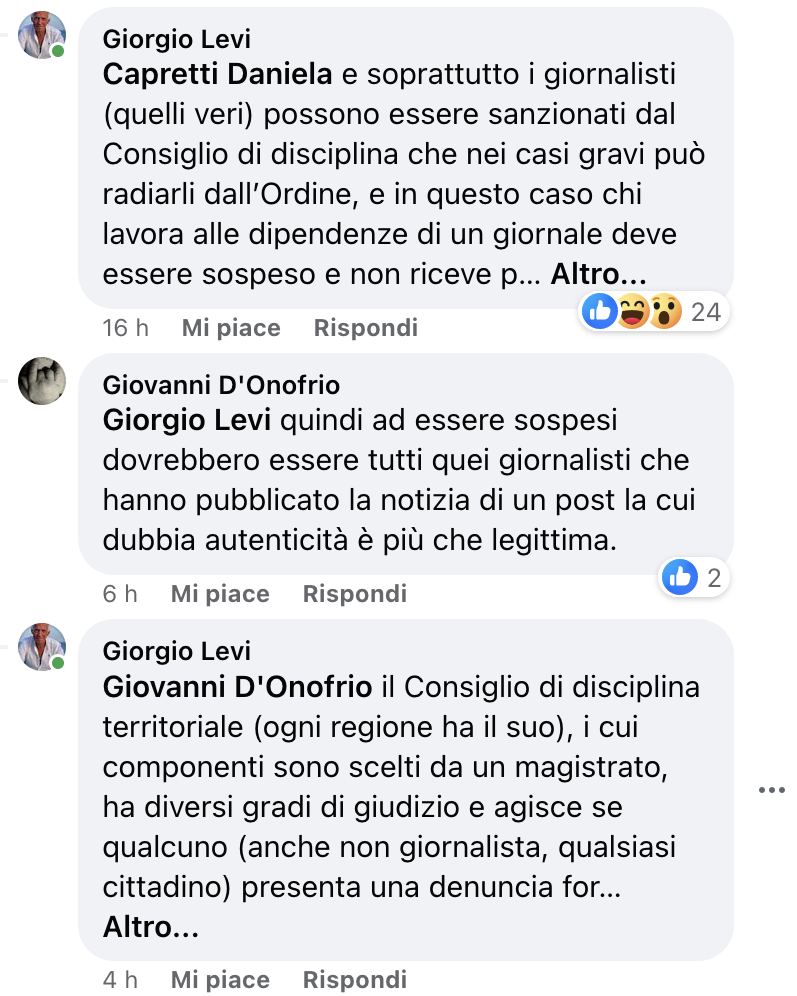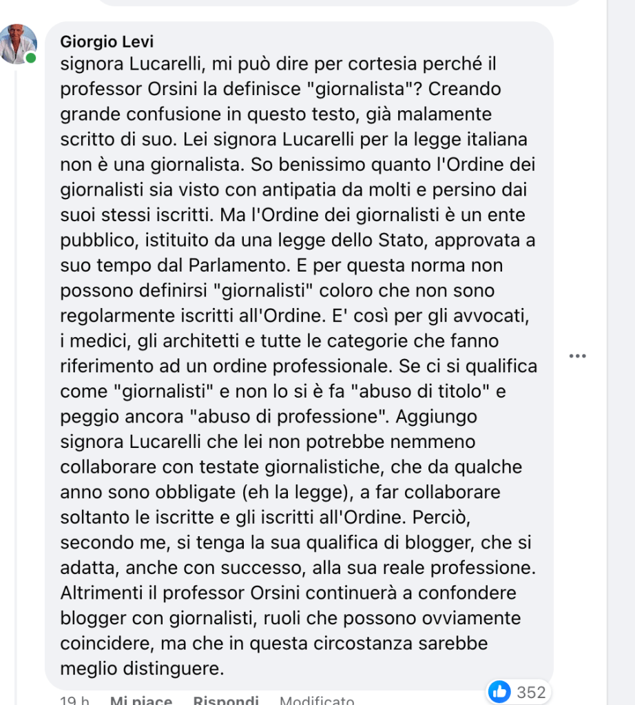 Orsini, nel suo testo, qualifica Lucarelli come giornalista. Io di solito non commento mai nessun post che non sia scritto da persone o colleghi che conosco. Questa volta l’ho fatto (qui sotto foto) per ricordare alla signora Lucarelli che non è una giornalista. E il qualificarsi come tale può generare quello che per legge si chiama “abuso di titolo” e pure “abuso di professione”.